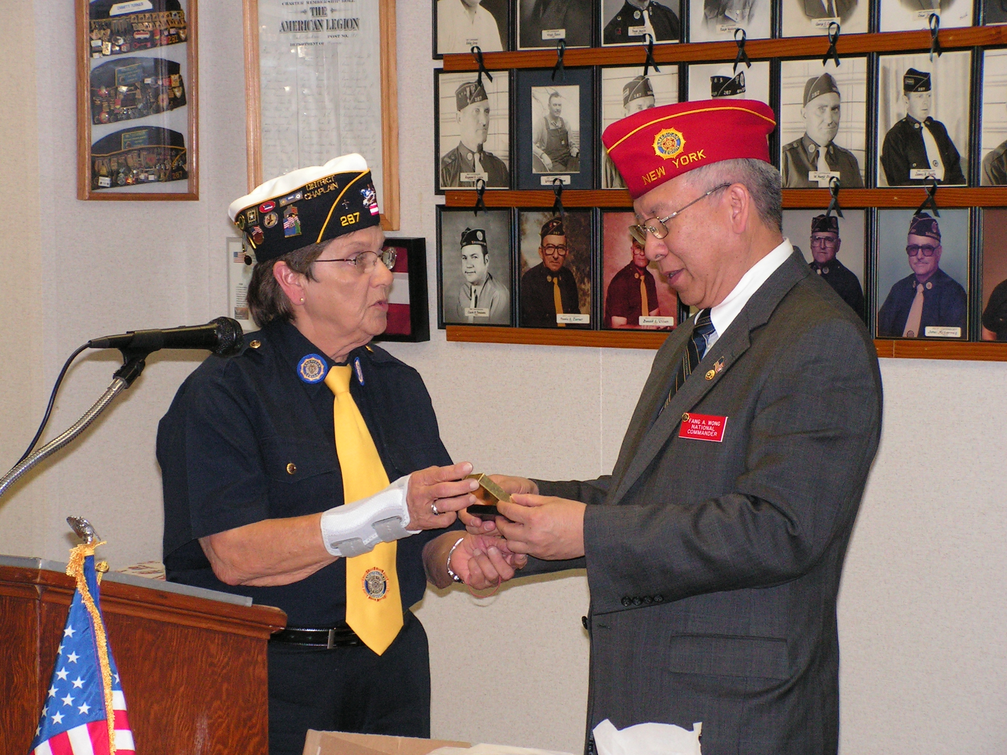 (L-R) Post 287 Commander Barb Ebersole presents a gift to National Commander Fang Wong